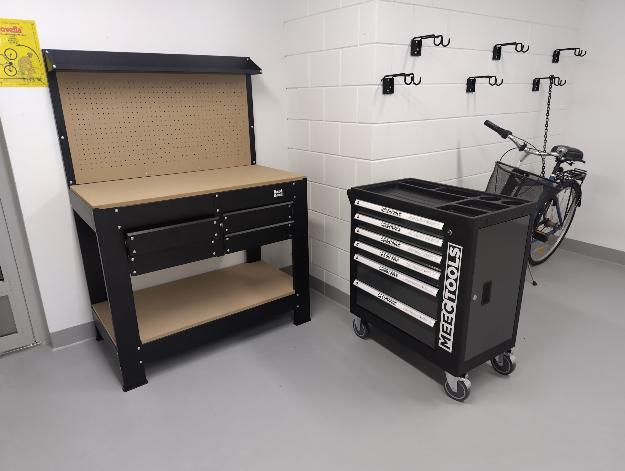 Huoltopiste toimii myös yleiskäyttöisenä pientyötilana, jossa voi tarvittaessa tehdä esimerkiksi rullaluistimien säätöjä, lastenvaunujen korjauksia tai muita kevyitä kunnossapitotöitä. Tila on hyvin valaistu ja suojassa säältä, joten työskentely onnistuu mukavasti vuodenajasta riippumatta.
